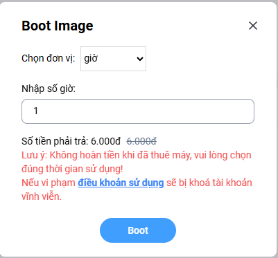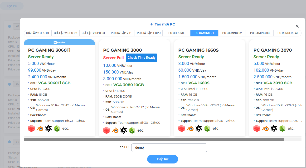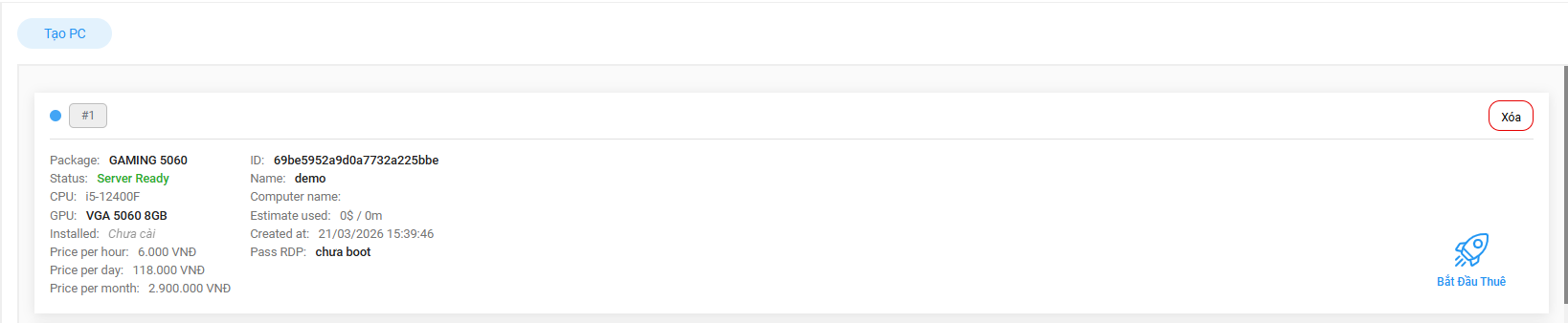 Cách sử dụng: Tạo PC -> chọn các cấu hình bạn muốn sử dụng -> đặt tên PC -> chọn Tiếp Tục -> Chọn Bắt đầu thuê -> chọn thời gian muốn sử dụng -> chọn Boot.