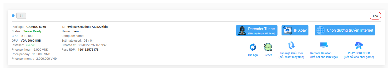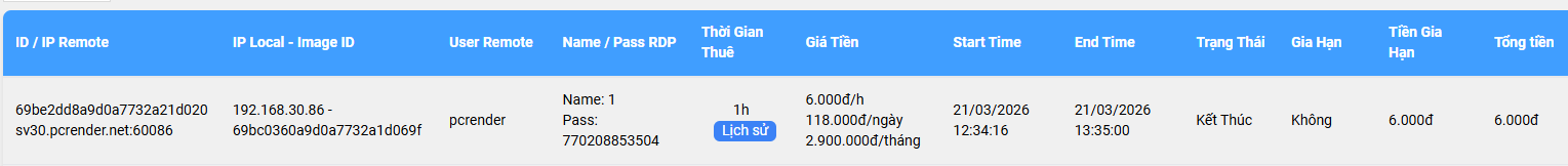 + ID / IP Remote: là thông tin ip để vào máy thuê khi dùng remote desktop, như ảnh là: sv30.pcrender.net:60086