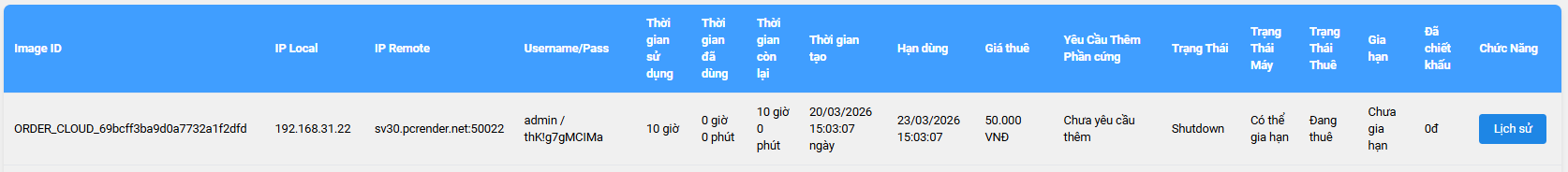 + Thông tin gói cloud thuê, gồm có nút lịch sử để xem chi tiết gói cloud sử dụng