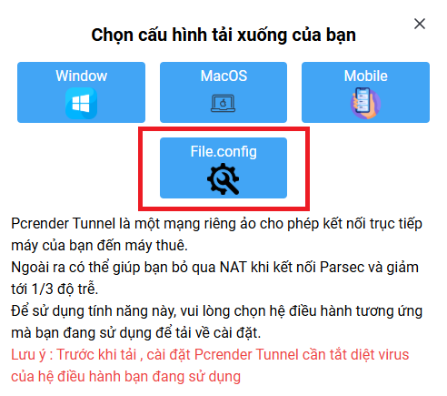 + Chọn tải file.config ở nút PCRENDER TUNNEL
